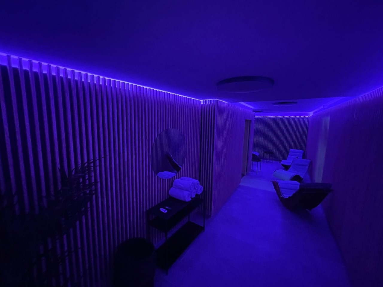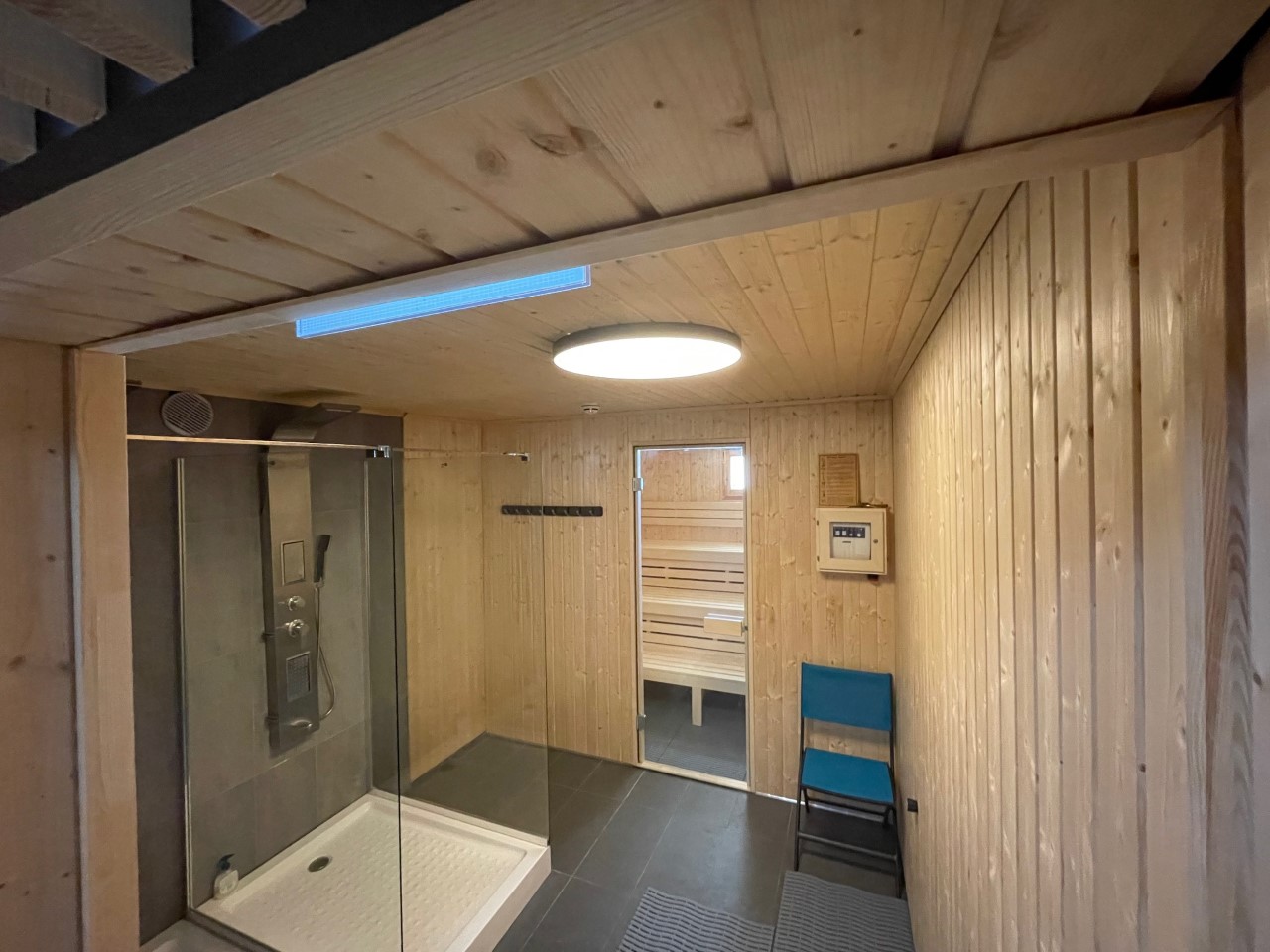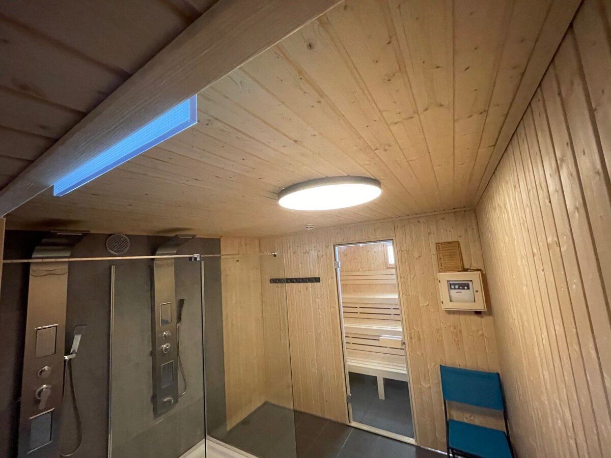 Wir haben die Sauna mit der dazugehörigen Dusche umgebaut und auch der kleine Ruhebereich daneben wartet wieder auf Sie.